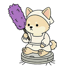This sticker set features a Chihuahua character riding on an automatic vacuum cleaner.