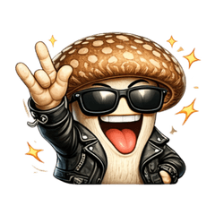 Big and bold! 40 Rockin Shiitake stickers for everyday use. A cool mushroom with sunglasses and a leather jacket brings fun, expressive vibes to your chats!
