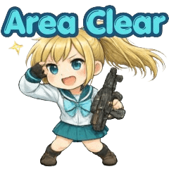 A cute sticker set featuring a chibi twin-tail gamer girl with FPS-inspired reactions, action poses, and everyday expressions.