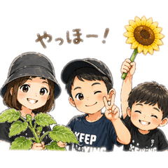 Animated emoji set with a large symbolic background motif behind each phrase.